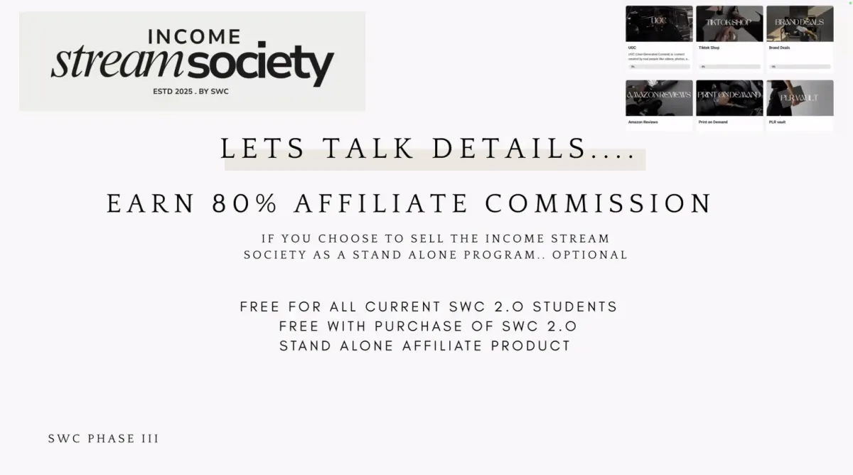 For a limited time, Income Stream Society™ is free when you join SWC 2.0. Later, it can also be sold as a stand-alone offer for $349, where you keep an 80% commission—$279 per sale.
