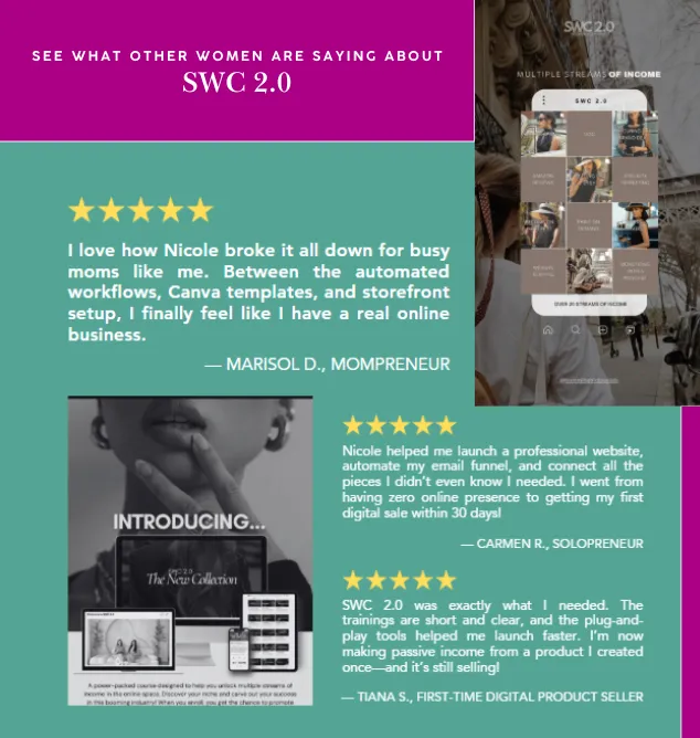 SWC 2.0 transformed my life—I'm Nicole, and I used this course to learn branding, digital marketing, affiliate marketing, UGC, and digital content creation. Now, I help everyday women over 40 launch flexible, digital income streams with confidence. Perfect for working women looking for flexible ways to earn online. No experience or big following needed. It's a beginner-friendly way to make passive income. Learn how to build a profitable digital income stream with no tech skills. Start with bite-sized steps and proven templates. Join a supportive community and discover how easy it can be.